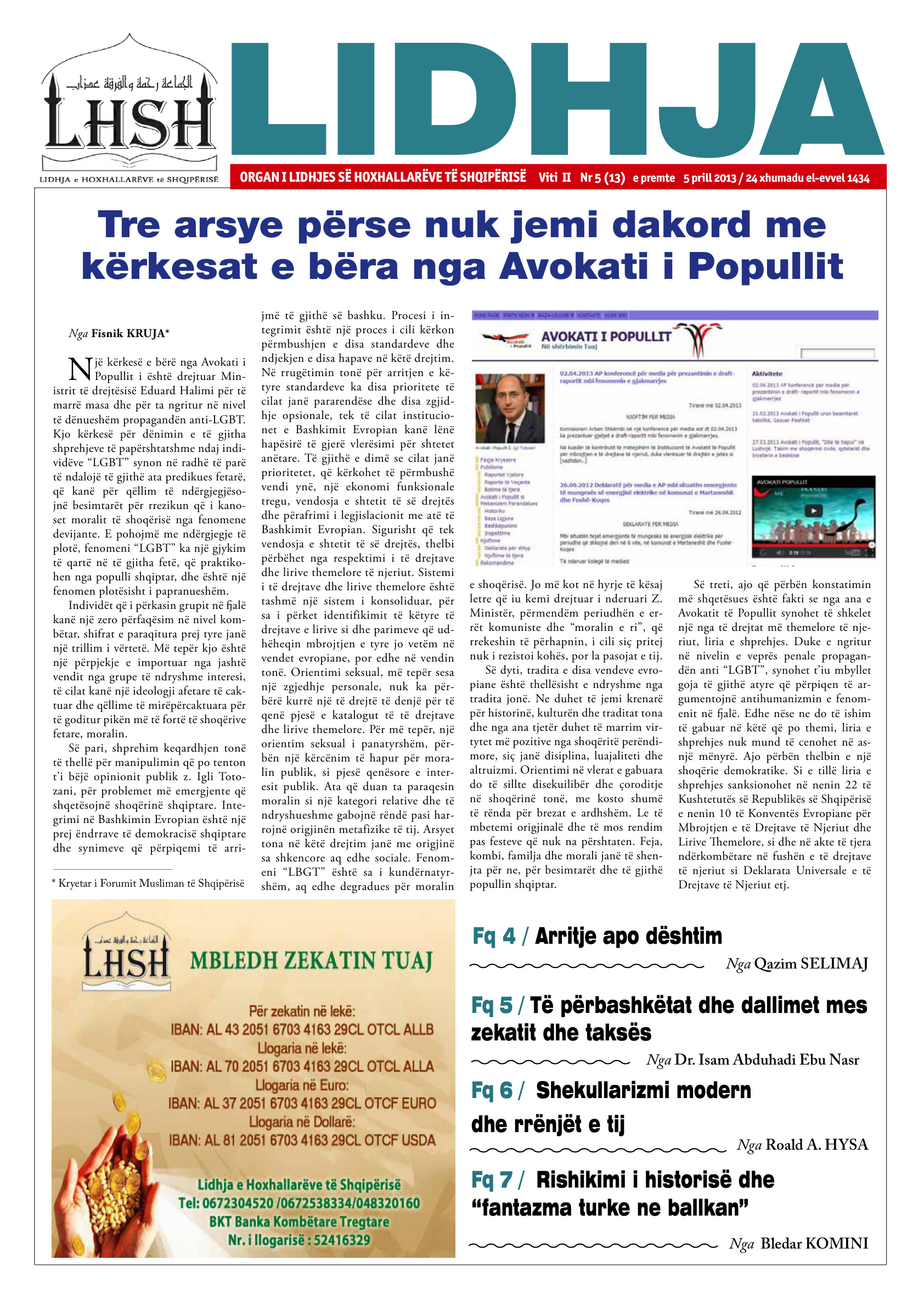 Përmbledhje nga numri: Lidhja ORGAN I LIDHJES SË HOXHALLARËVE TË SHQIPËRISË Viti II Nr 5 (13) e premte 5 prill 2013 / 24 xhumadu el-evvel 1434 Fq 5 / Të përbashkëtat dhe dallimet mes zekatit dhe taksës Tre arsye përse nuk jemi dakord me kërkesat e bëra nga Avokati i Popullit Fq 4 / Arritje apo dështim Nga Fisnik KRUJA* N jë kërkesë e bërë nga Avokati i Popullit i është drejtuar Min- istrit të drejtësisë Eduard Halimi për të marrë masa dhe për ta ngritur në nivel të dënueshëm propagandën anti-LGBT. Kjo kërkesë për dënimin e të gjitha shprehjeve të papërshtatshme ndaj indi- vidëve “LGBT” synon në r…