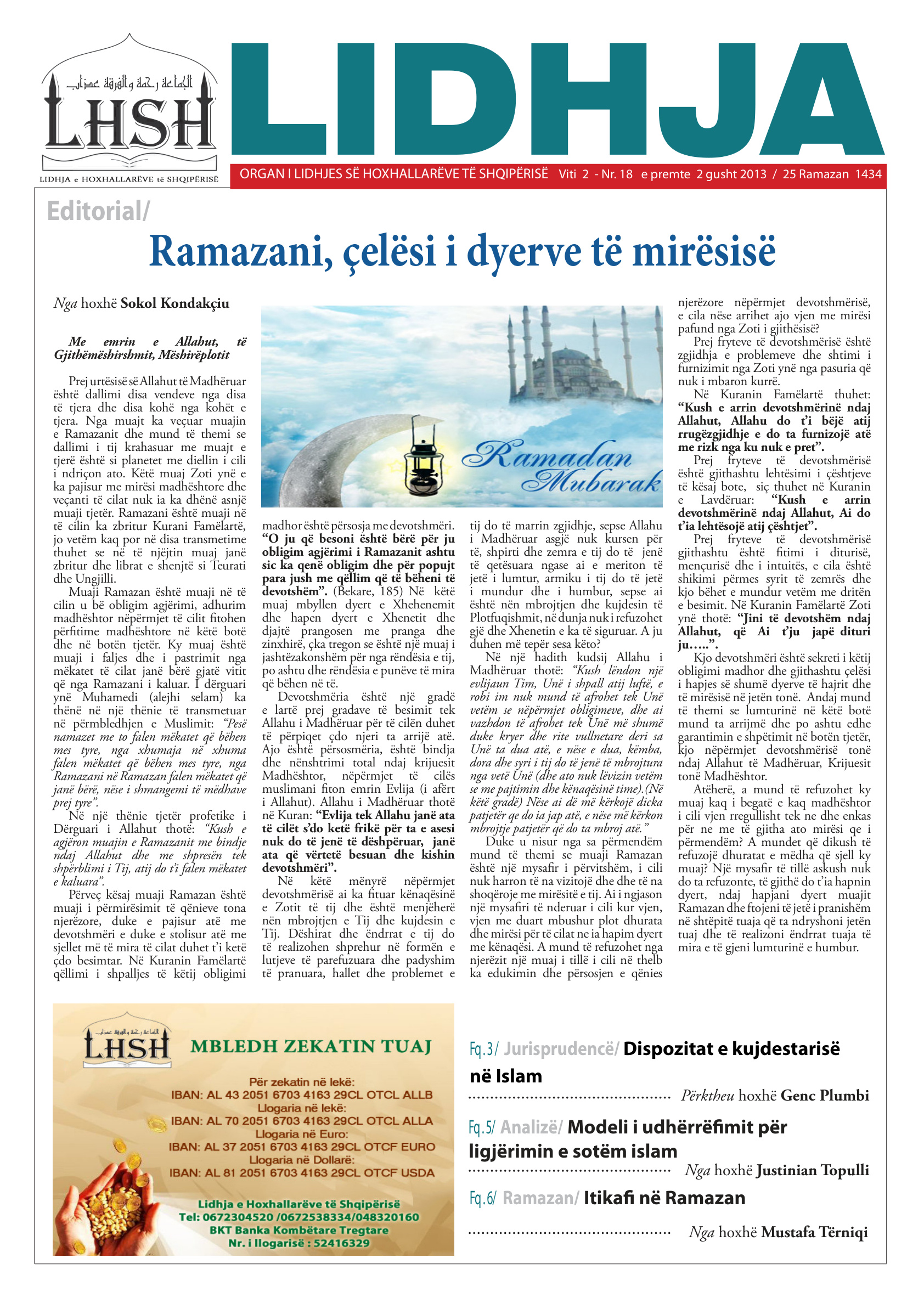 Përmbledhje nga numri: ORGAN I LIDHJES SË HOXHALLARËVE TË SHQIPËRISË Viti 2 – Nr. 18 e premte 2 gusht 2013 / 25 Ramazan 1434 Editorial/ Përktheu hoxhë Genc Plumbi Me emrin e Allahut, të Gjithëmëshirshmit, Mëshirëplotit Prej urtësisë së Allahut të Madhëruar është dallimi disa vendeve nga disa të tjera dhe disa kohë nga kohët e tjera. Nga muajt ka veçuar muajin e Ramazanit dhe mund të themi se dallimi i tij krahasuar me muajt e tjerë është si planetet me diellin i cili i ndriçon ato. Këtë muaj Zoti ynë e ka pajisur me mirësi madhështore dhe veçanti të cilat nuk ia ka dhënë asnjë muaji tjetër. …