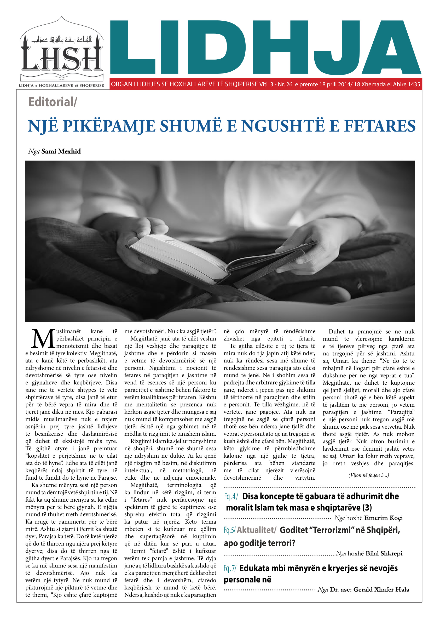 Përmbledhje nga numri: ORGAN I LIDHJES SË HOXHALLARËVE TË SHQIPËRISË Viti 3 – Nr. 26 e premte 18 prill 2014/ 18 Xhemada el Ahire 1435 Editorial/ M uslimanët kanë të përbashkët principin e monoteizmit dhe bazat e besimit të tyre kolektiv. Megjithatë, ata e kanë këtë të përbashkët, ata ndryshojnë në nivelin e fetarsisë dhe devotshmërisë së tyre ose nivelin e gjynaheve dhe keqbërjeve. Disa janë me të vërtetë shtypës të vetë shpirtërave të tyre, disa janë të etur për të bërë vepra të mira dhe të tjerët janë diku në mes. Kjo pabarasi midis muslimanëve nuk e nxjerr asnjërin prej tyre jashtë lidhjeve të b…