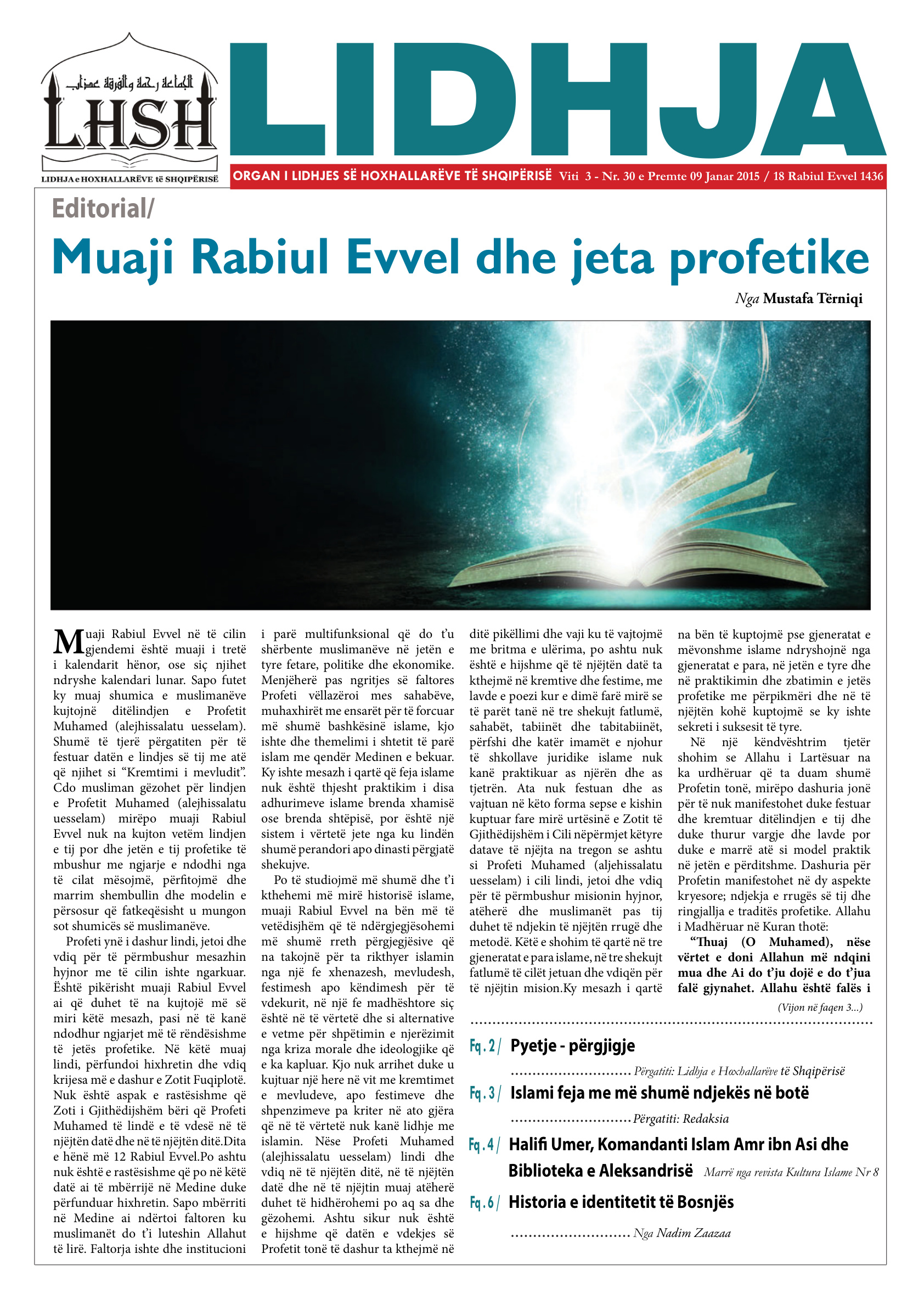 Përmbledhje nga numri: Fq . 6 / Historia e identitetit të Bosnjës Fq . 4 / Halifi Umer, Komandanti Islam Amr ibn Asi dhe Biblioteka e Aleksandrisë Fq . 2 / Pyetje – përgjigje Përgatiti: Lidhja e Hoxhallarëve të Shqipërisë Fq . 3 / Islami feja me më shumë ndjekës në botë Përgatiti: Redaksia ORGAN I LIDHJES SË HOXHALLARËVE TË SHQIPËRISË Viti 3 – Nr. 30 e Premte 09 Janar 2015 / 18 Rabiul Evvel 1436 Editorial/ M uaji Rabiul Evvel në të cilin gjendemi është muaji i tretë i kalendarit hënor, ose s…