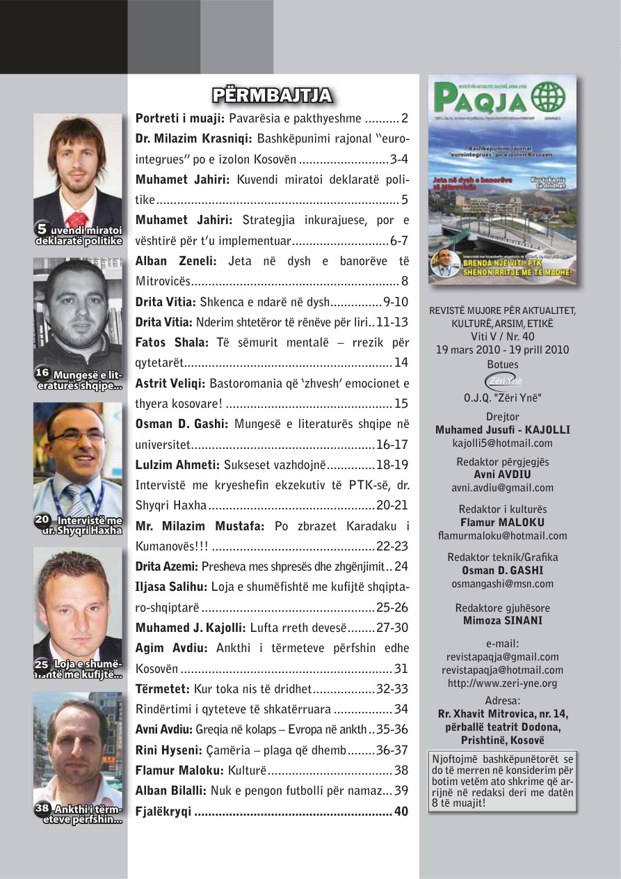 **Revista Paqja** – Numri Nr. 040. Data e nxjerrjes: Mars 2010. Përmbajtja: PAQJA