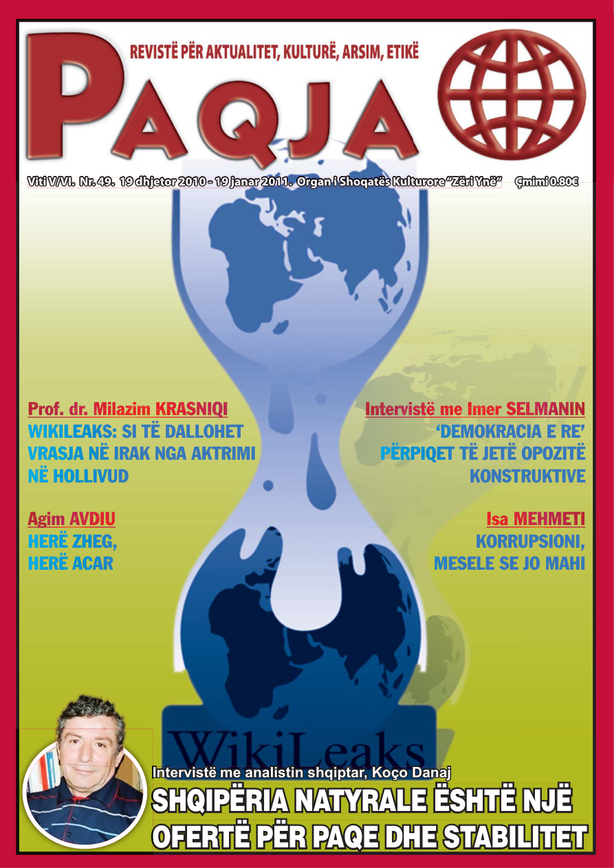 **Revista Paqja** – Numri Nr. 049. Data e nxjerrjes: Dhjetor 2010. Përmbajtja: SHQIPËRIA NATYRALE ËSHTË NJË OFERTË PËR PAQE DHE STABILITET Intervistë me analistin shqiptar, Koço Danaj Viti V/VI. Nr. 49. 19 dhjetor 2010 – 19 janar 2011. Organ i Shoqatës Kulturore “Zëri Ynë“ Viti V/VI Nr 49 19 dhjetor 2010 – 19 janar 2011 Organ i Shoqatës Kulturore“Zëri Ynë Vit Vititi V/V /VI VI Nr 49 49 19 dhjeto eto tor 20 2 10 – 19 janar 20 2 11 Org rg rgan i Shoqatës Kulturore“Zëri Ynë n i Shoq oqatë atë tës ës Ku Kultlturo ro rore re re“Zë “Zëriri Yn Yn Y ë“ ë“ ë“ ë“ Çmimi 0.80€ Pro…