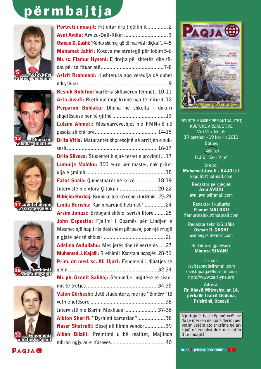 **Revista Paqja** – Numri Nr. 055. Data e nxjerrjes: Korrik 2011. Përmbajtja: PAQJA 1 Nr. 55■QERSHOR/KORRIK’11 Analiza 1 Nr. 55■QERSHOR/KORRIK R ’11 K Ana za An Analiza za REVISTË MUJORE PËR AKTUALITET, KULTURË, ARSIM, ETIKË Viti VI / Nr. 55 19 qershor – 19 korrik 2011 Botues O.J.Q. “Zëri Ynë” Drejtor Muhamed Jusufi – KAJOLLI [email protected] Redaktor përgjegjës Avni AVDIU [email protected] Redaktor i kulturës Flamur MALOKU [email protected] Redaktor teknik/Grafika Osman D. GASHI [email protected] Redaktore gjuhësore Mimoza SINANI e-mail: revistapaqja@gmail…